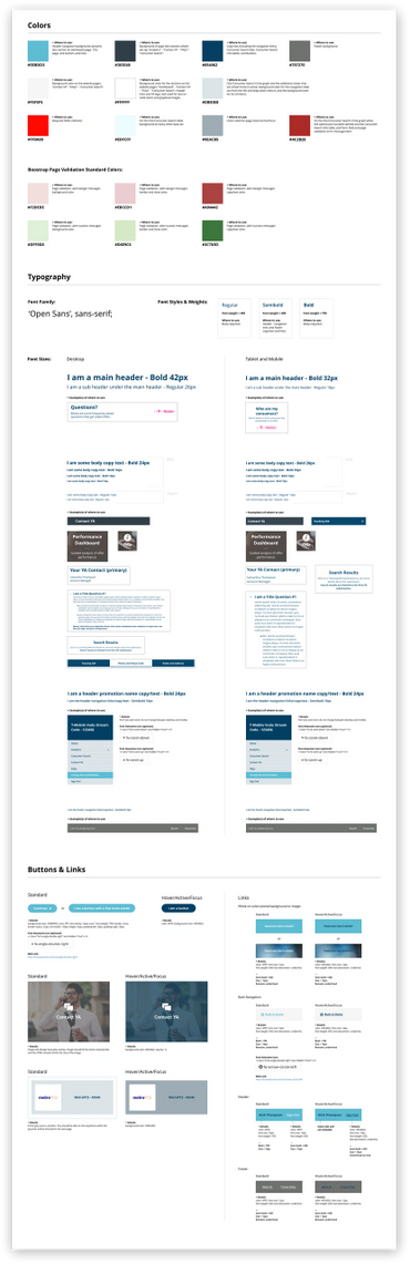The Client Portal was a first of its kind for YA. Gathering information in the beginning before designing the webpages and the detailed styles was crucial to execute and to understand what the Product Manager wanted and what YA wanted too. The use of a site map and Jira stories created by a Business Analyst (BA) was important to help figure our what types of pages and information needed. It was my responsibility to interpret those details from the site map and Jira and create a web design that a developer could then create. I utilized my understanding of front-end HTML/CSS and bootstrap techniques/skills to come up with the webpages without using any code. A final detailed style guide was created for the developer/s to use for the creation of the website. The detailed style guide worked out very well and I received a large amount of praise for the work that was put into developing such a robust piece of creative that a developer could reference when creating the website.