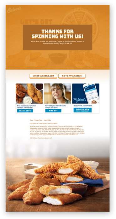 The Culver's Dip It & Spin It online sweepstakes gave consumers the chance to try their luck at spinning a wheel for prizes and entering to win a final prize. The website was fully customized with animation of moving images onto the webpage and the wheel spinning just with a click of a button.