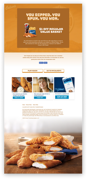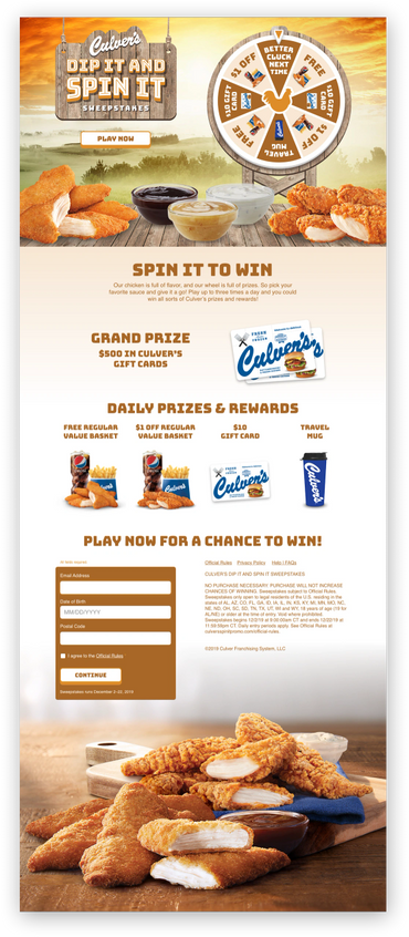 The purpose of this instant win sweepstakes for Culver's was to get people to visit and eat at their nearest Culver's restaurant. There was no purchase necessary to enter so consumers could come to the Culver's Dip It & Spin It sweepstakes website where they would be required to enter some validation information, choose a dipping sauce, spin the wheel that was a customary design for the dip sauce chosen, and then would be presented with a winner or non-winner message.