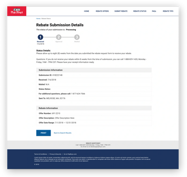 The purpose of this rebate portal for Pep Boys was to provide an online way to submit rebates. After consumers have bought specific products that qualifies for a rebate, they would come to the portal and enter their purchase information from their receipt, select the specific rebate, answer a few questions, and claim their rebate. The consumer was also able to print PDF rebate forms for a mail-in option and can check the status of their rebate via the website too.
