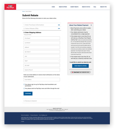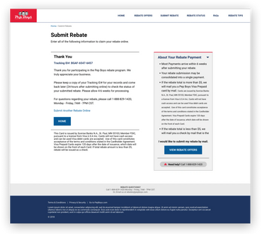 The Pep Boys Rebate portal was a new website that was created so consumers had the option to submit online instead of only mail-in. The rebate portal supported online rebate submissions, PDF versions of offer forms, and checking the status of a previously submitted rebate offer.